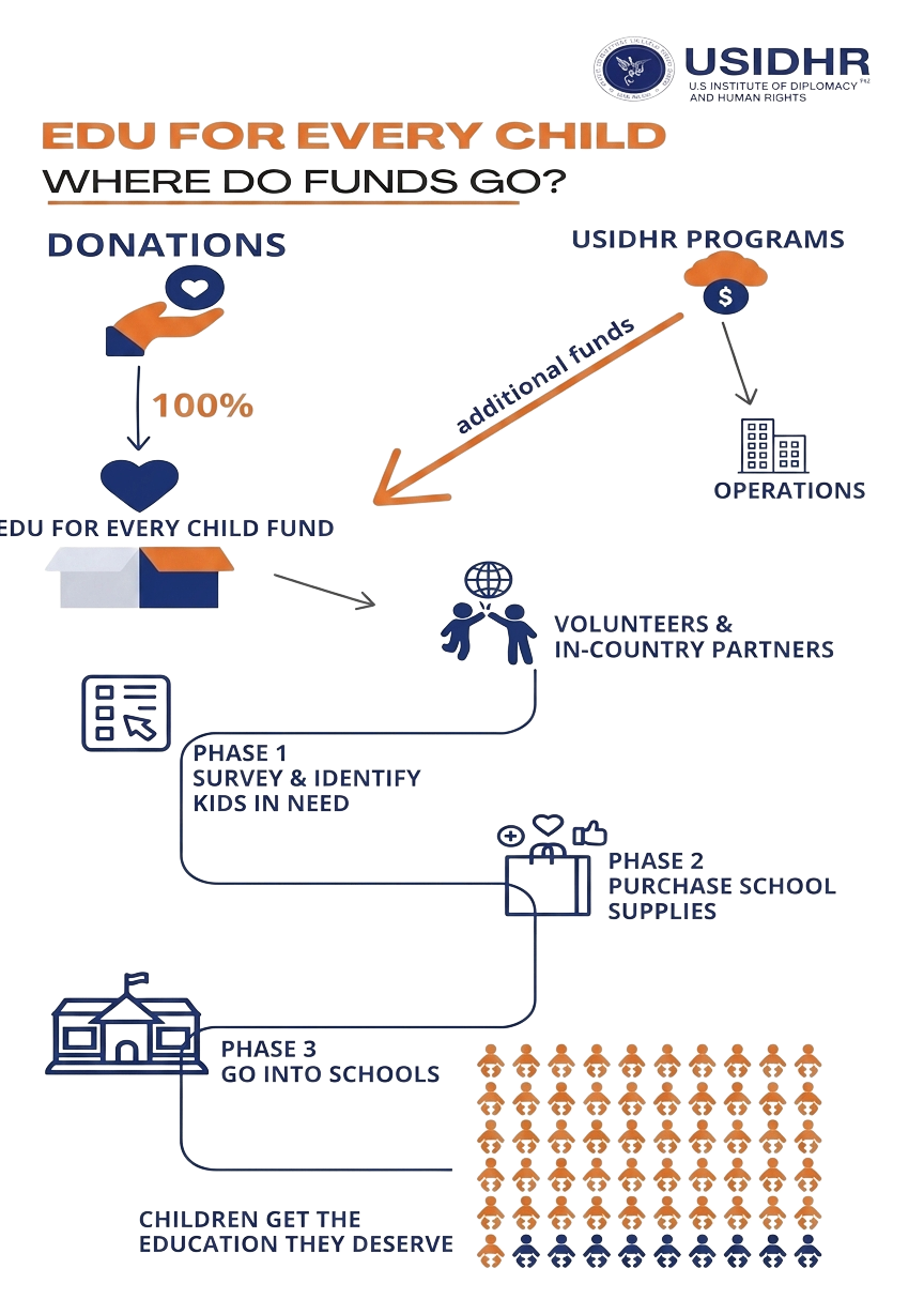 At USIDHR, we believe that every donor deserves clarity and confidence in how their contribution is used. That is why all donations to the Edu for Every Child program are directed toward providing children from low-income communities with the resources they need to attend school.
